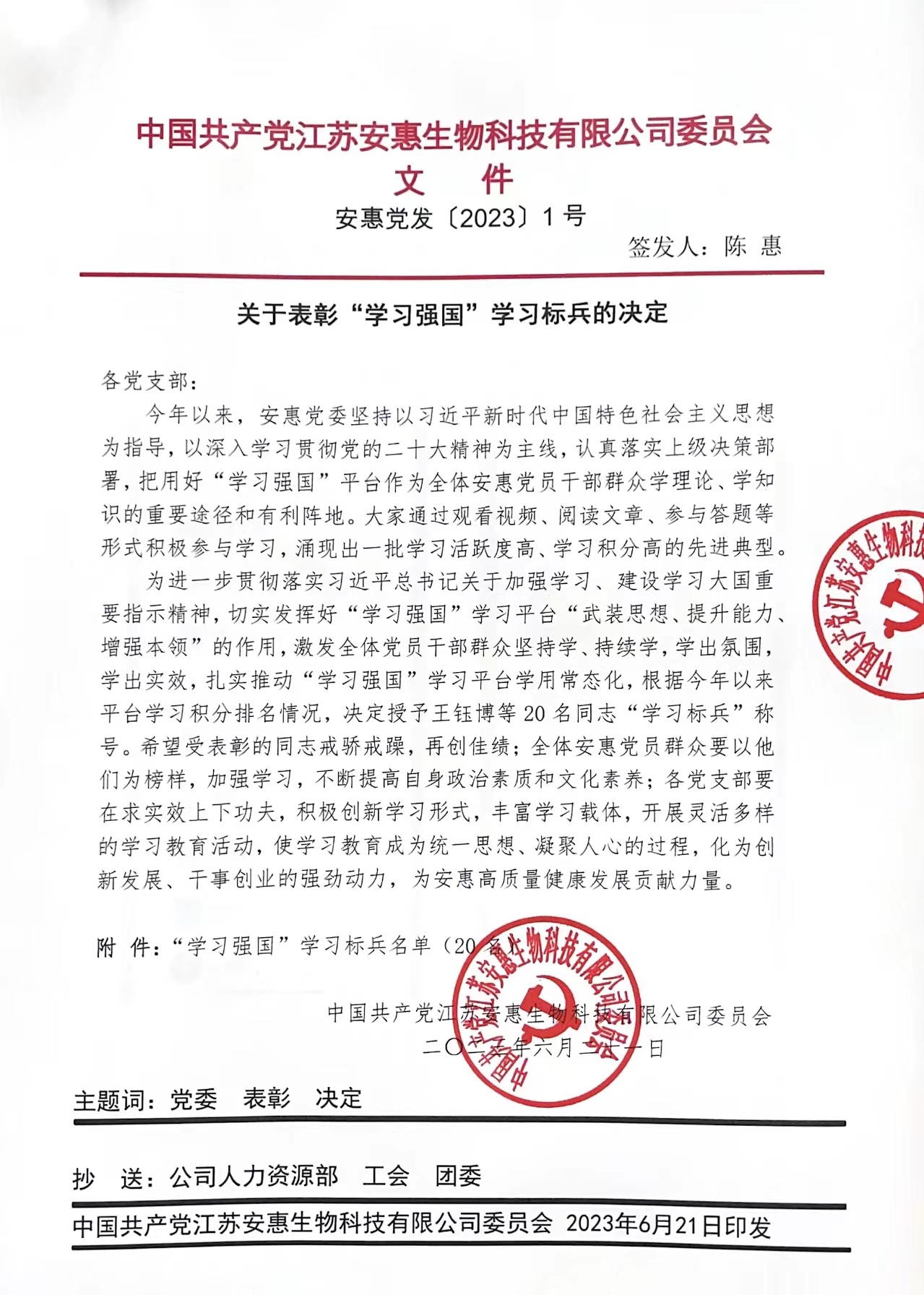 安惠黨委關于表彰“學習強國”學習標兵的決定
